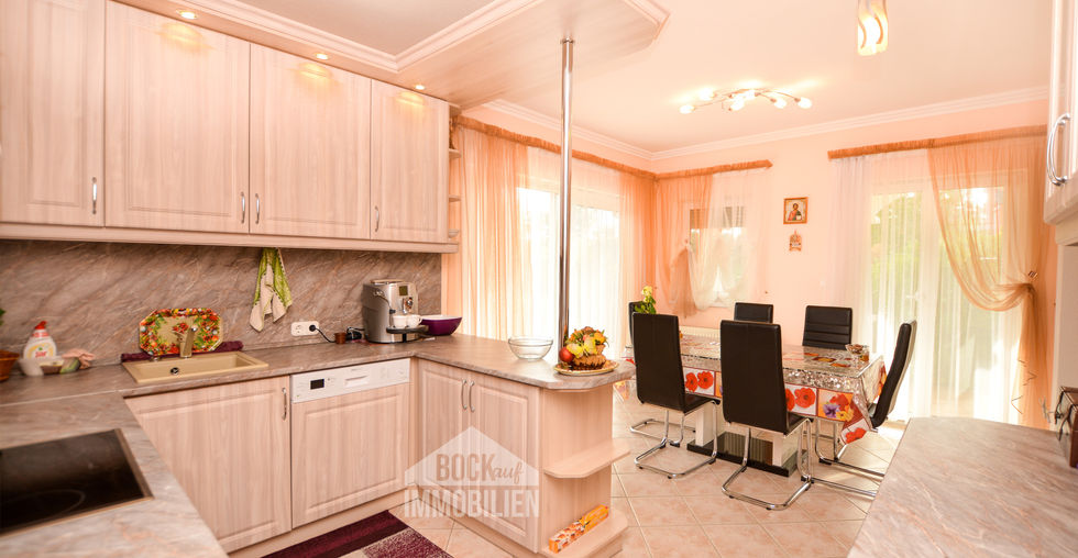 Erdgeschoß: Wohnzimmer + Diele, Küche + Essraum, Speisekammer, Abstellraum,